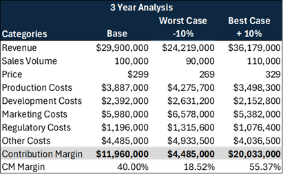 Therefore, I want to understand what happens to my Cost of Goods Sold when the cost of whey protein increases by 1%, and I would build a sensitivity analysis to calculate the impact. I could do this for all key variables and see how they impact different financial outcomes.