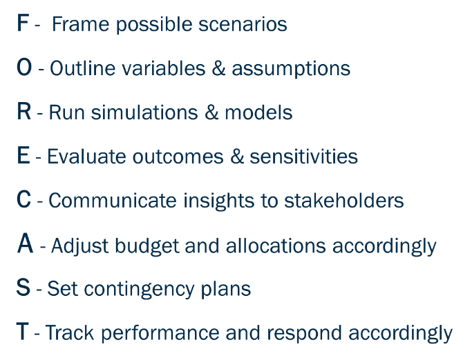 T - Track performance and respond accordingly - The final step is to track your performance and ensure the business reacts appropriately. This includes monitoring alternative scenarios for trigger points and responding in accordance with your contingency plans when necessary. When implementing alternative scenarios, make sure you track the impact of each response.