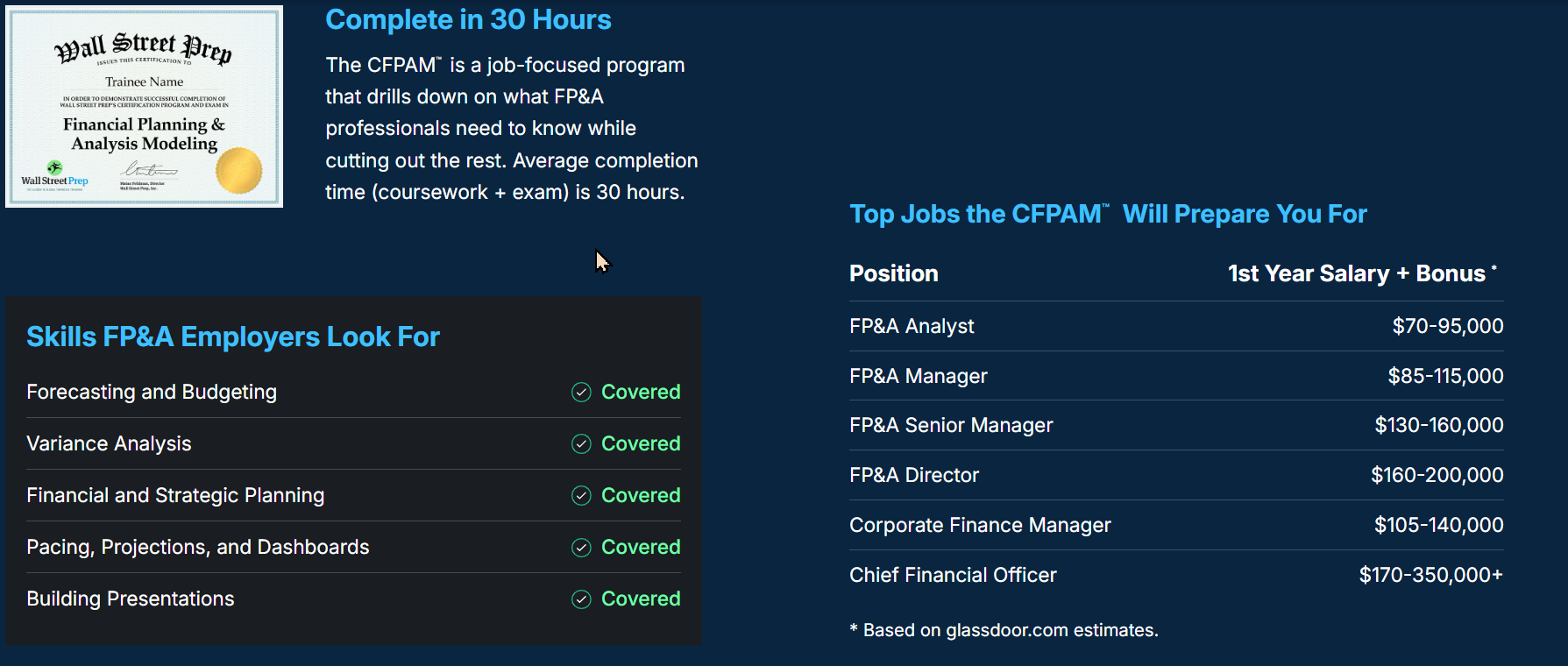 The Financial Planning & Analysis Modeling (CFPAM) program by Wall Street Prep is a comprehensive training program designed to develop modeling skills. Participants will learn to build detailed financial models, create budgets and forecasts, and deliver actionable insights to support strategic decision-making. This program was created prior to the new Certificate of FP&A offered by Wharton Online and Wall Street Prep.