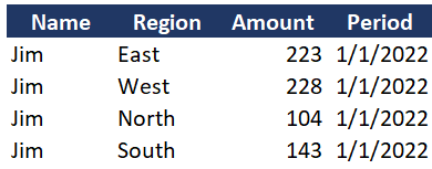 5. Each field/column houses its own type of data (i.e., Month, Product, amount, geographic region, etc.)